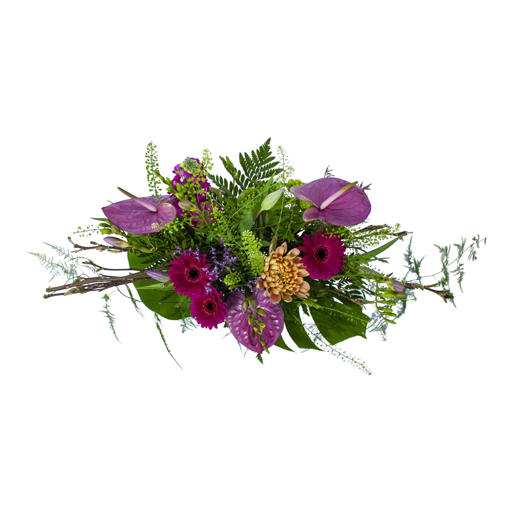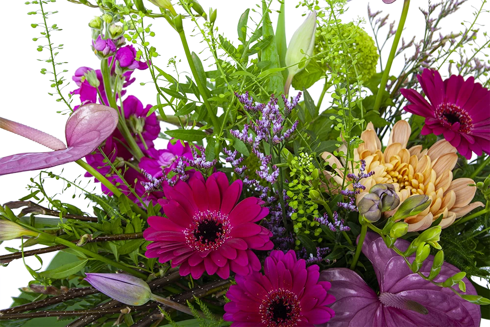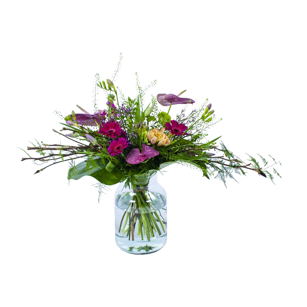 De combinatie van de kleurrijke paarse bloemen geven het bladboeket een prachtige en chique uitstaling. Dit bladboeket creëert een gezellige sfeer in elke ruimte. Bovendien geschikt voor verschillende gelegenheden. Feliciteer, bedankt of verstuur zomaar dit prachtige handgebonden boeket en verras de ontvanger! * Exclusief accessoires en vaas