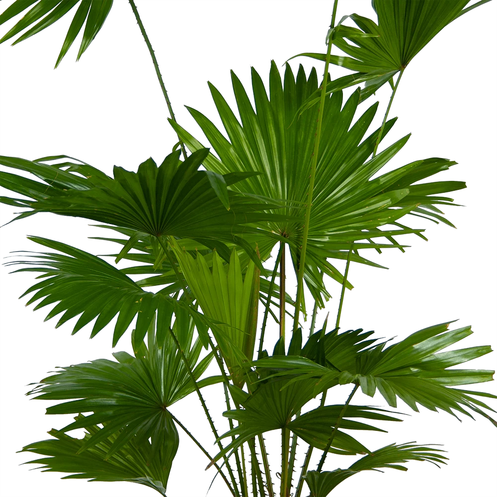 De waaierpalm heeft de bladvingers aan elkaar vergroeid waardoor ze hun grote waaiervormige bladeren hebben gekregen. De Livistonia rotundifolia heeft een luchtzuiverende werking.