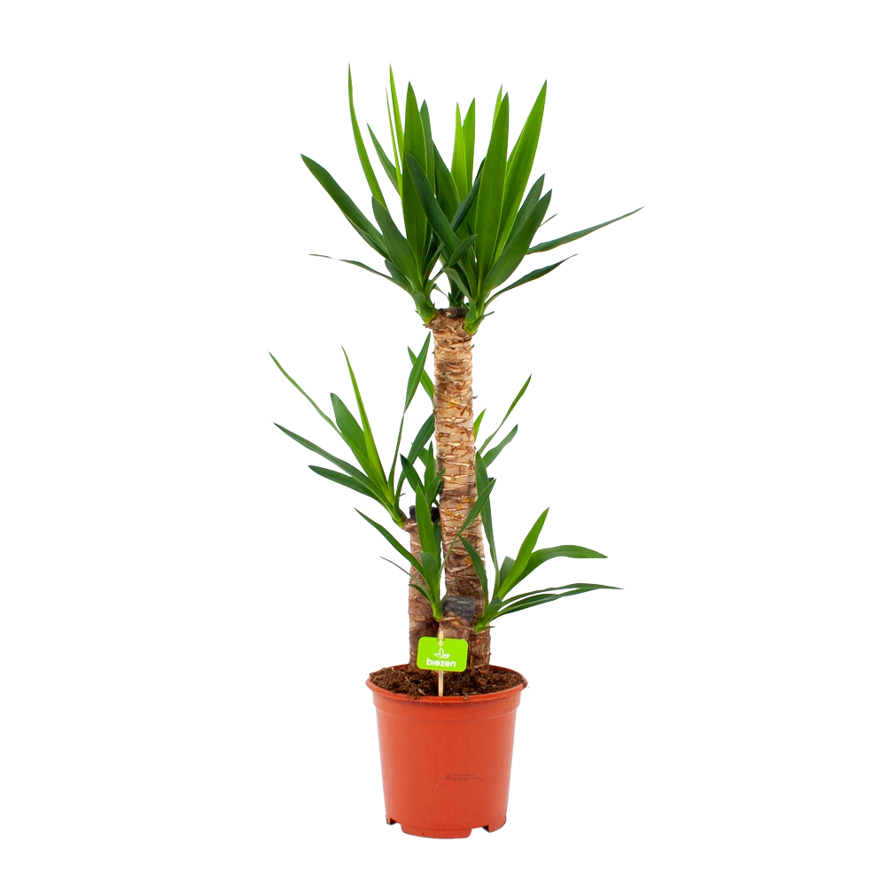 De Yucca is een makkelijke kamerplant die weinig verzorging verlangt. Maar let op met kinderen en huisdieren, want het sap van deze plant is giftig. De Palmlelie is een stoere plant die opvalt door zijn dikke bruine stam met daaraan langwerpige groene bladeren. Hij komt goed tot zijn recht op een lichte plek met direct zonlicht. Geef de Palmlelie regelmatig water en zorg dat de grond tussen het water geven door kort opdroogt.